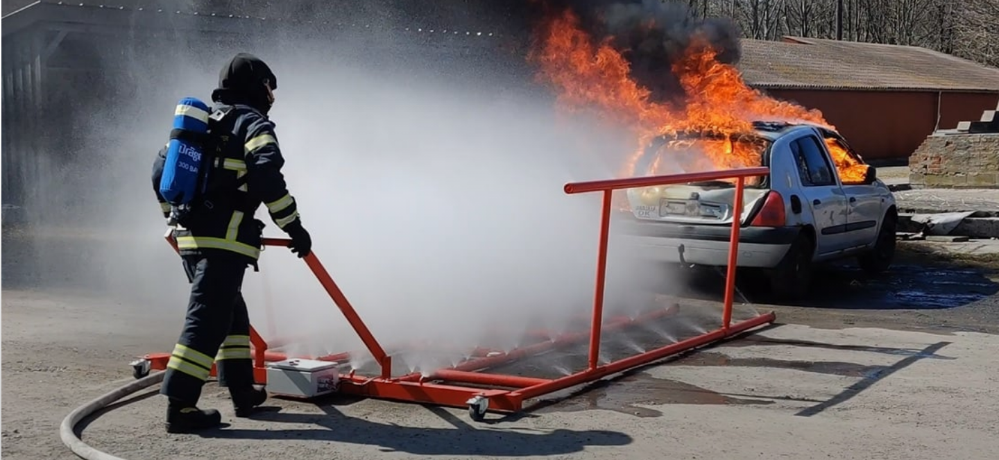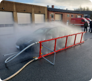 電動車底盤噴射器可放置於燃燒的電車下方或周圍,所釋放之細水霧可持續冷卻電動車下方之鋰電池模組並有效控制熱失控(Thermal Runaway)避免車輛延燒,並使救災人員與火場保持一定距離進而提高人員之安全性。